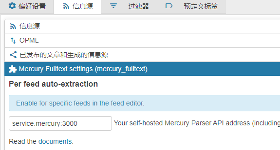mercury-fulltext插件 - 偏好设置-信息源-Mercury Fulltext settins 中设置地址